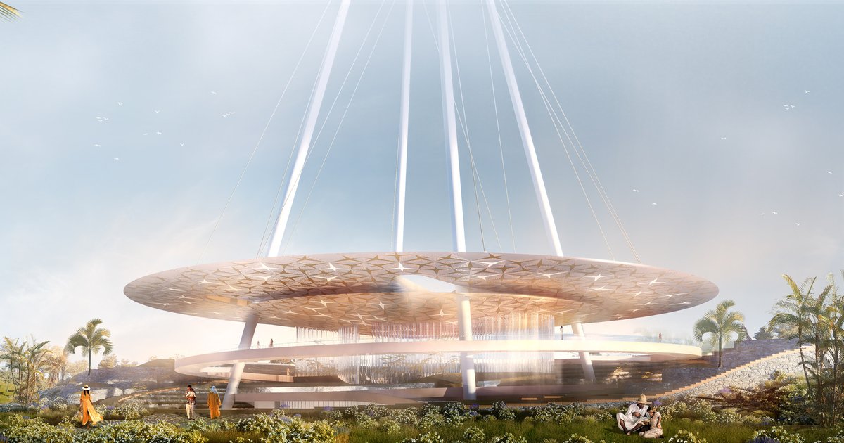 The goal of our project is to break down the barrier between wildlife and humans. In our project, we have created an oasis in which people and nature achieve the highest harmony. The architectural solution is based on the image of a freedom-loving Ibis bird. The image of a bird soaring in the sky inspired us to create a weightless roof that magically levitates above the ground. The roof pattern borrows the mashrabiya pattern, which is characteristic of the architectural code of Morocco. The roof pattern is developed based on the analysis of historical and modern architectural elements of Morocco. The outline of an Ibis is used in the mashrabiya pattern. The decorative elements of the roof patterns are not only an ornament, but also serve as light lanterns, creating at night the image of birds flying out of the nest. The "nest" is a theater hall. The main hall is surrounded by a relief made in the form of terraces opening onto the water surface. The theater uses a system of multi-level pedestrian ramps that circle the theater creating their own story and inviting people to immerse themselves in a fairy tale. Pedestrian ramps can also be used for immersive performances. The irrigation system with natural irrigation of landscaping is carefully thought out in the project. It is carried out by collecting precipitation from the roof plane. Water is collected in an artificial tank built into the roof and is used for watering green spaces. Solar panels are built into the roof, accumulating energy. The stored energy is used to provide power to a huge demonstration screen placed on the upper surface of the roof. During festivals and shows that unfold around the object, this media screen is a key part of the presentation.