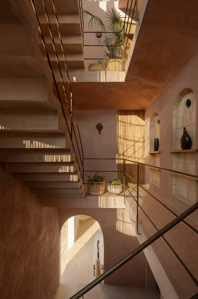 - Airflow: Open west façades with palm bone doors encourage natural ventilation, while strategically placed grills and a central staircase create a chimney effect that removes hot air efficiently.