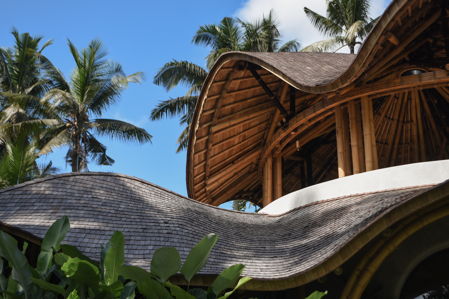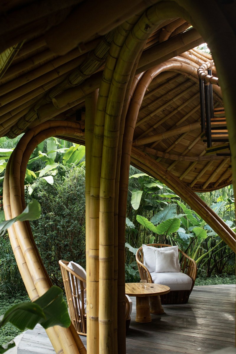 The project is defined by its iconic bamboo arches, which curve organically to embrace panoramic views of rice paddies and forest canopies. The expressive use of natural materials, including bamboo, stone, and polished concrete, not only anchors the building in its tropical context but also promotes sustainability and low environmental impact.