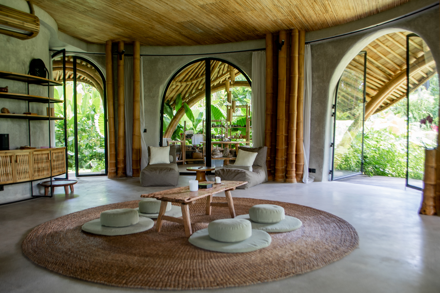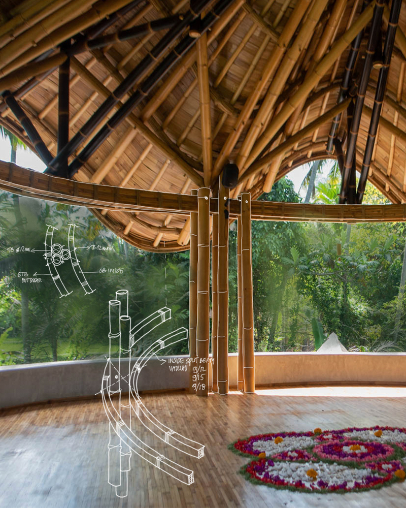 Accessed via a sculptural spiral bamboo staircase, the second floor hosts the Yoga Shala—a tranquil, open-air pavilion surrounded by soaring bamboo arches. Designed to provide 360-degree panoramic views, this meditative space fosters deep environmental connection and spiritual grounding.