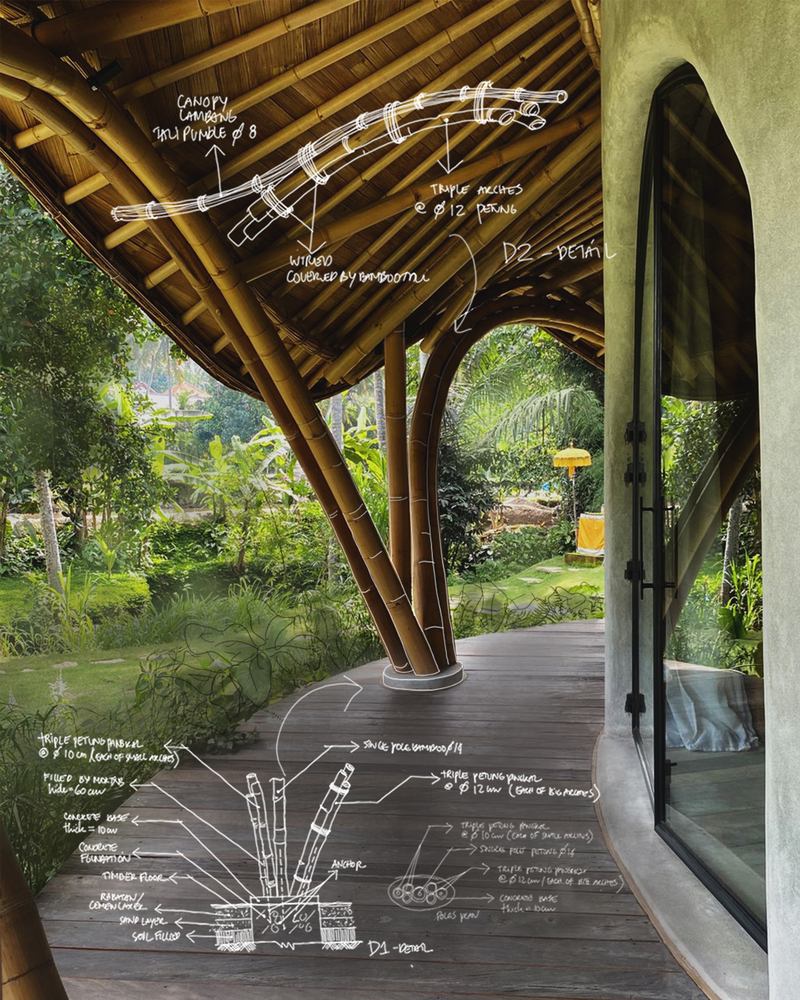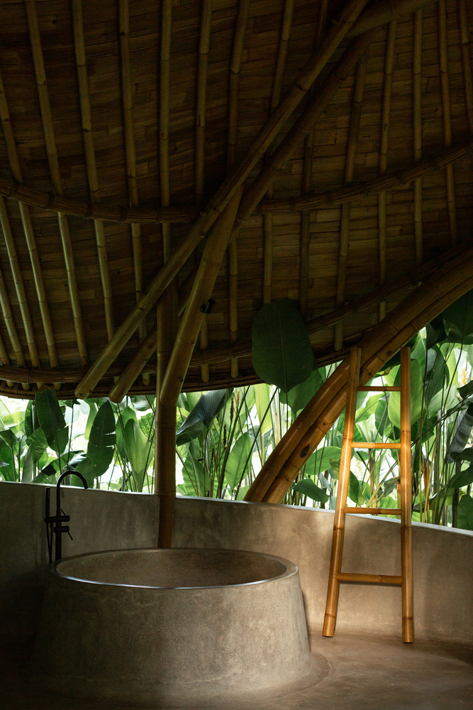 - A semi-open spa area, featuring a bamboo-framed bathroom with handcrafted stone and concrete finishes.