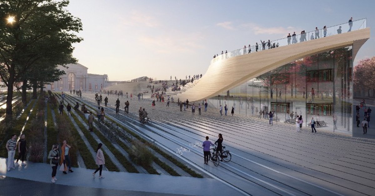 The temporary kiosks and offices that have been installed over recent decades will be removed, and the clarity of the existing 9,000 sq. m station will be restored. The station will also be linked with a new public transport terminal for the city’s bus networks. This terminal will be designed as an inhabited landscape within the upgraded Stories Square park in front of the station. Its outdoor amphitheatre and ramp will lead to a public terrace on its roof.