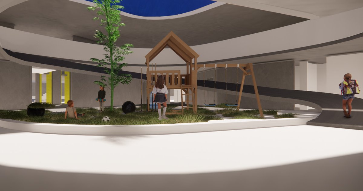 area, and the playground. The landscape comprises of open assembly arena and a playground with