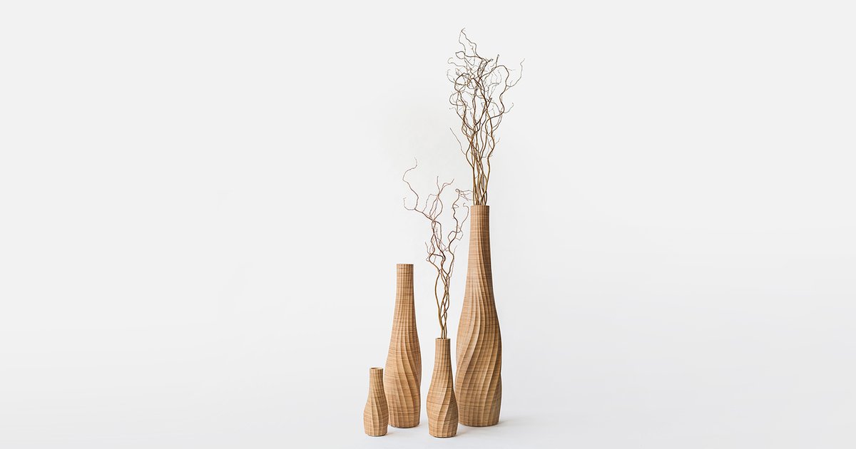 AESTUS blends material and machine: As a series of stratified wooden vases, AESTUS is designed and manufactured to explore a new synthesis of traditional materials and modern technology. Carved from hundreds of layers of wood by an industrial robot, the vases capture the fluidity of the machine's movements in the depth of the wooden texture.