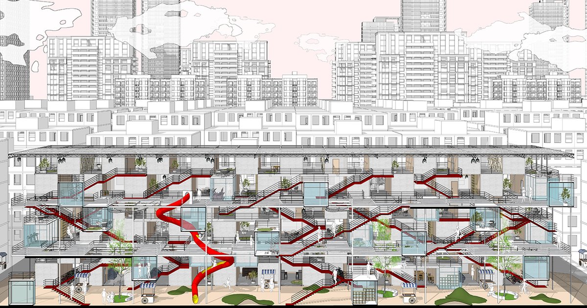 We hope to design a new prefabricated module to propose a solution to inferior daylight,ventilation and sanitation for low-rent Community. Alternate overlapped modules can save half the amount of materials, thereby reducing construction costs and making it affordable for low-income people.Variable units can be inhabited by different owners alternatively.