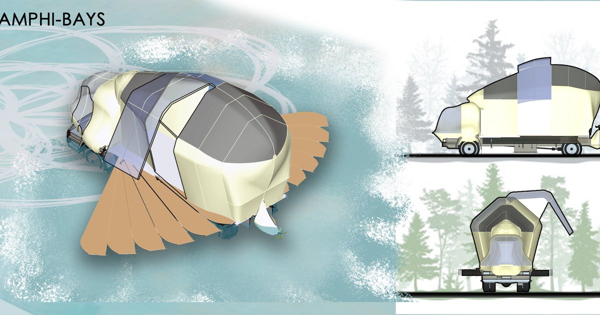 Love the inspiration of crustaceans and insects - it wasn't clear to me if the design can fly or swim, but it was a beautiful envelope. More flexibility and spacious design in the interior could elevate the concept, as well as self sustaining energy and water. But overall a beautiful design.