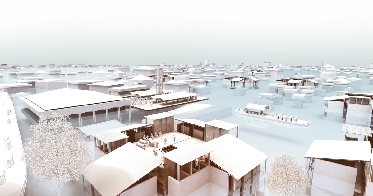 Amphibious Commons is a strategy that works across public spaces in Kerala, from a single cluster, to a market, to a regional transit network. During flood conditions, it restores what the flood removes, a shared ground plane, and in post flooding conditions, this public ground becomes a formwork for bamboo reinforced concrete construction.