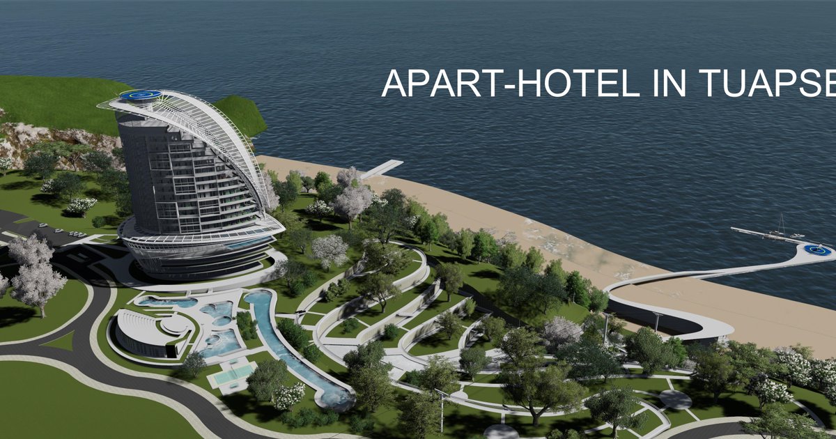 The apart-hotel is designed to meet the requirements of the BREEAM green energy efficiency standard. The building includes 102 rooms (apartments and studios), and a full 5-star service system: a restaurant, food court, spas, a swimming pool, and sports facilities. On the plot there is a parking, an amphitheater, swimming pools, a park and bungalows.