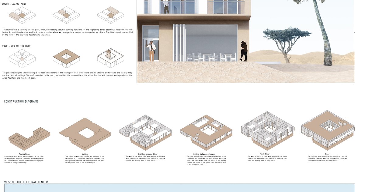 Project of a cultural center located in Morocco, near the city of Marrakesh., The building refers to local architecture, where the most important place is the courtyard, creating the center of the complex. Structure was located near a water reservoir in a desert oasis. The facility becomes an oasis for visitors, a place of rest and refuge.