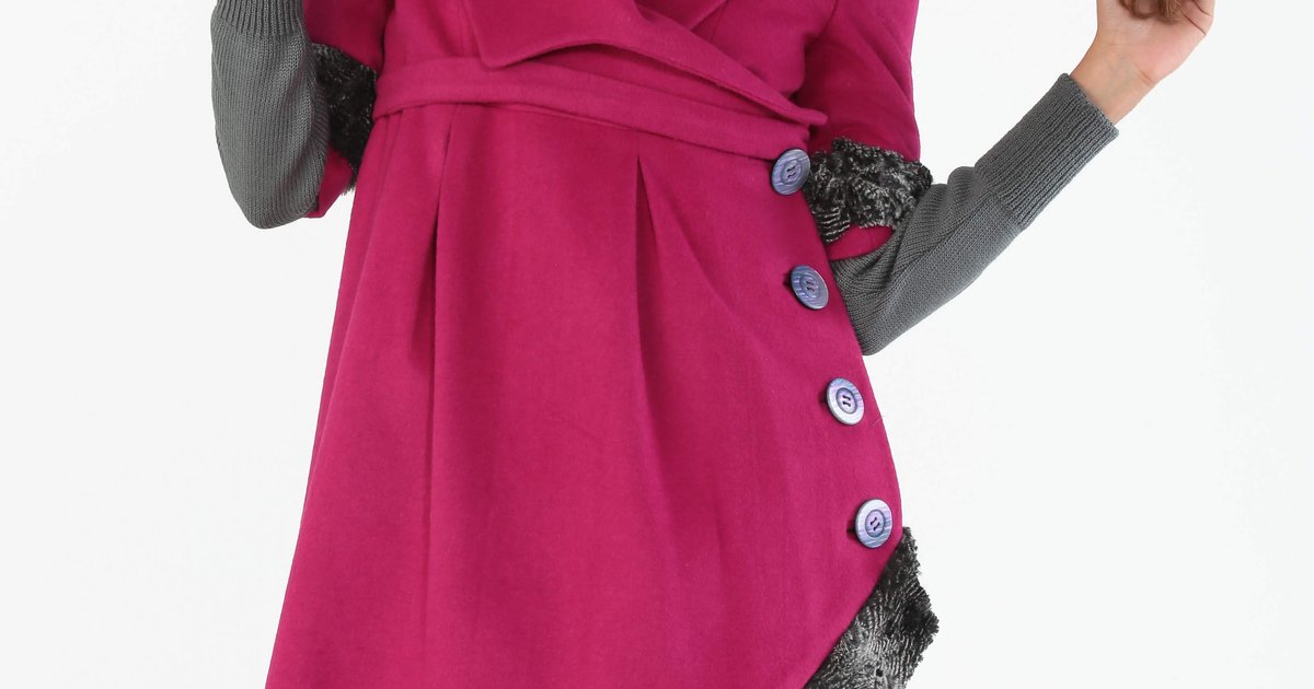 Coat made in angora cloth that overlaps. Purple buttons on the left and belt that ties around the waistline. Empire waistline. Midi sleeves with furry ends. Furry collar. (Faux fur). Magenta with a hidden purple panel. Flowery hand-sewn embroidery in magenta with matching pearl-like crystals. Golden lining.