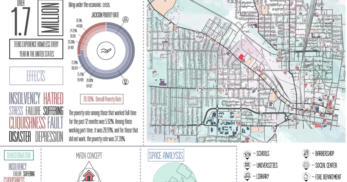 The project is a complex of dormitories with a public function for teenagers who have been left without housing. The idea of the project is to rehabilitate homeless students through socialization and creativity, but at the same time give them protection, a shelter for a normal life and study.