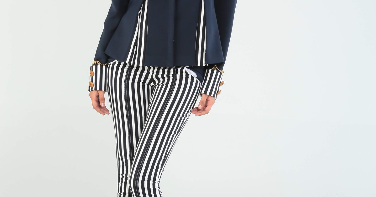 Blue jacket with empire cut and panels. Panels have a white and blue striped pattern. Pointy shoulders. Rolled-up cuffs in striped pattern. Golden details on the shoulders, collar and buttons. Doble-layered, very wide collar. Golden lining.