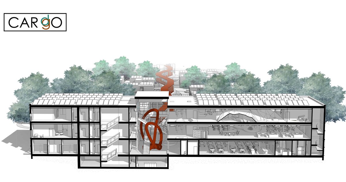 The project is consist on modular container housing units and a common building connected togetner with a two-level pathway. In the main building there are open- space areas for studying and various activities. Habitable units are divided into four groups, each with a semi- private area.