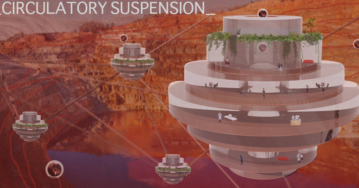 Located in the Rio Tinto Mines in Spain, a system of units suspended within a framework connected and functioning as circulatory systems. The design allows for circulation and cycles of nature, water, and people within the structures and throughout the site of the archeological park.