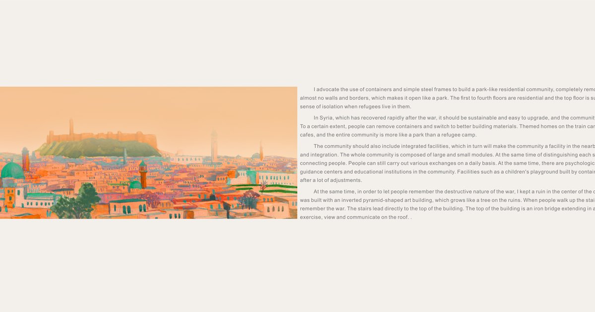 I advocate the use of containers and simple steel frames to build a park-like residential community, completely removing the borders. The GF floor has almost no walls and borders, which makes it open like a park. The first to fourth floors are residential and the top floor is surrounded by a flyover. There is no sense of isolation when refugees live in them.