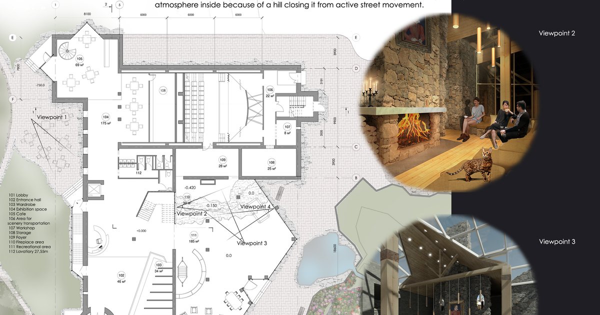 5. How did you use building materials to convey the same? Glass is an lightweight, transparent material, that destroys limits between surrounding environment and inner space of the building. Stone walls are heavy, massive and solid as old fortresses. They close a man from the other world and defend him.