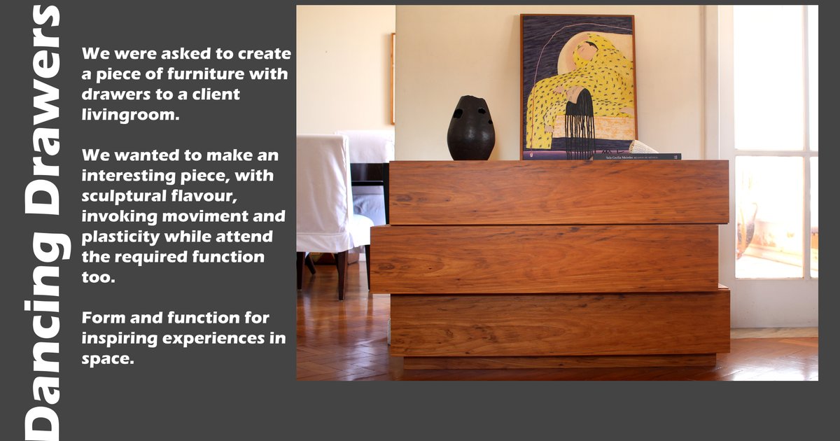 We were asked to create a piece of furniture with drawers to a client livingroom. We wanted to make an interesting piece, with sculptural flavour, invoking moviment and plasticity while attend the required function too. Form and function for inspiring experiences in space.
