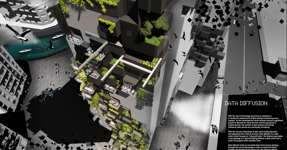 Data diffusion looks at conventional data centre issues tackling through the use of technology in order to make the hybrid building sustainable for living use. The ideology behind the building is based on the ‘data core’ powers the building through the diffusion of pixels(data and living spaces).