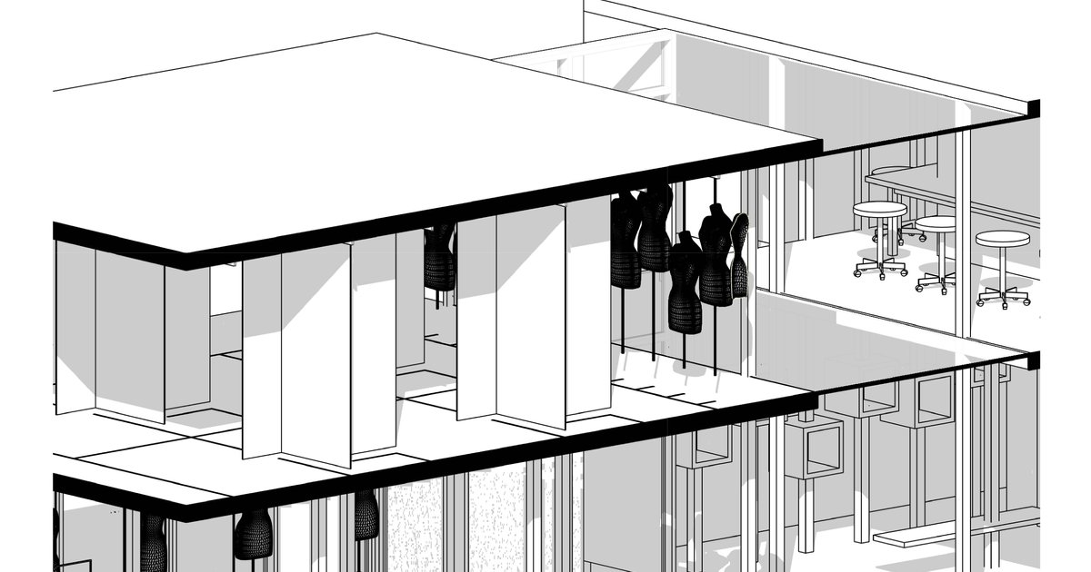 This space is designed as a fashion design school. The concept of this design is to separate the working area from the display area. Moreover, the material used in this design provides a different experience in the space as it changes from a transparent to a translucent to an opaque area.