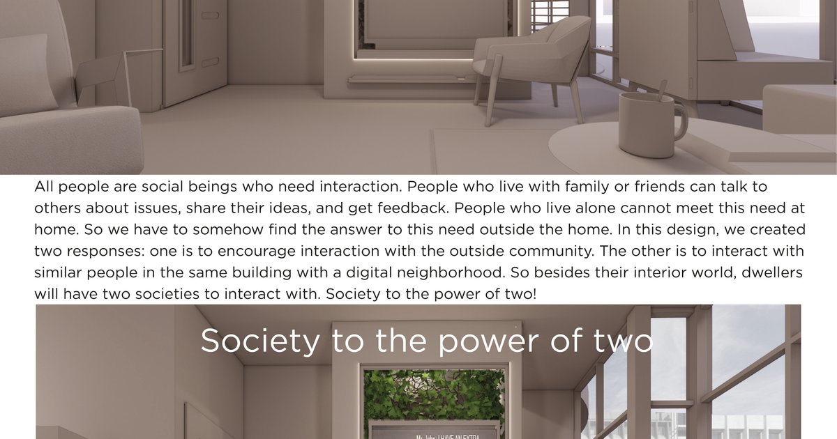 In this design, we created two responses for the lack of people in single dwellers' life: one is to encourage interaction with the outside community. The other is to interact with similar people in the same building with a digital neighborhood. So besides their interior world, dwellers will have two societies to interact with. Society to the power of two!