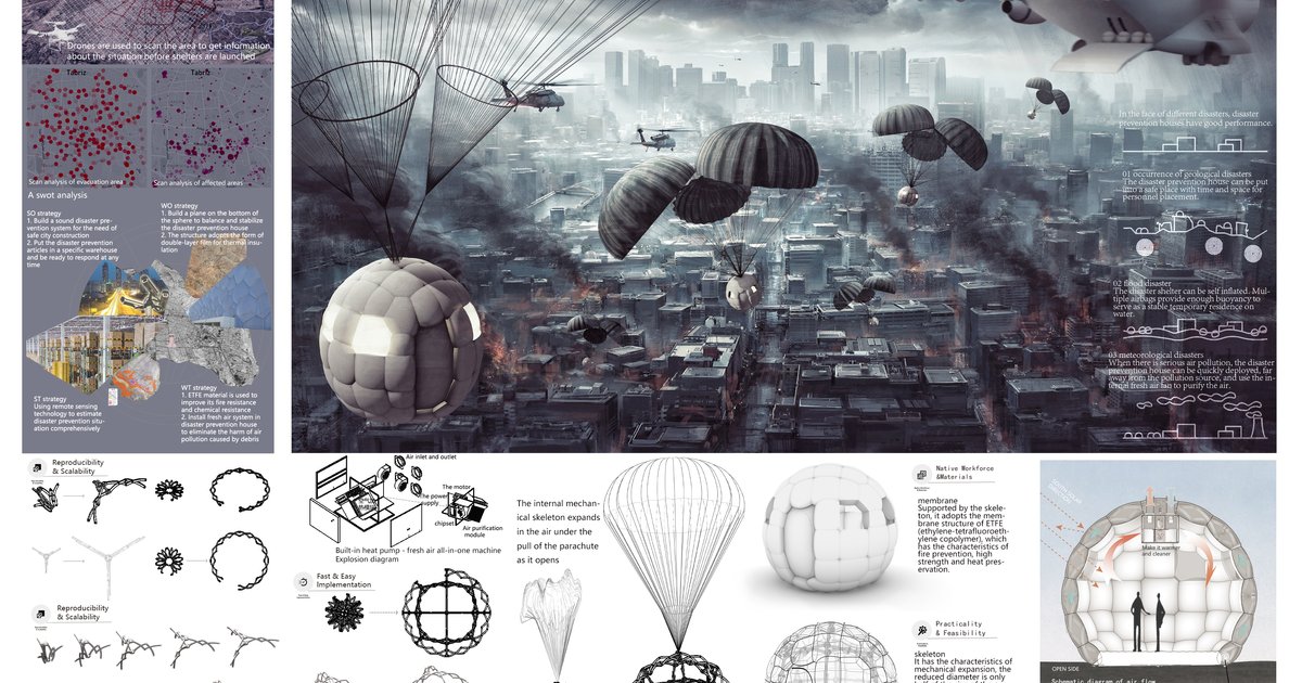 This design is a foldable refuge house design. The structural system is based on the study of mechanical structure. The double-layer membrane structure can perfectly match the expansion and expansion of the structural system, making it feasible.The purpose of rapid deployment can be achieved by means of centripetal contraction and expansion and air drop.