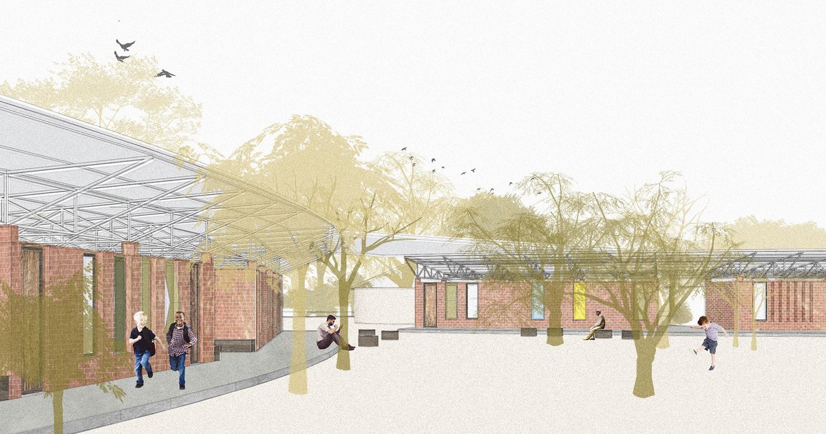 View of communal space between church school and community center