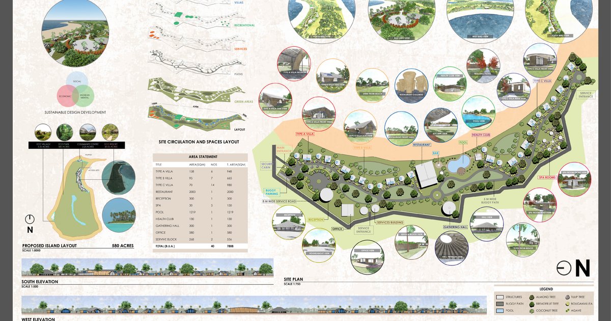 This dissertation revolves around developing an island that is self-sufficient by all means and further investigates the possibility of creating a self-sustaining island focusing on aspects that are very important to the humans, namely, social, economic and environmental factors and their connection to architecture.