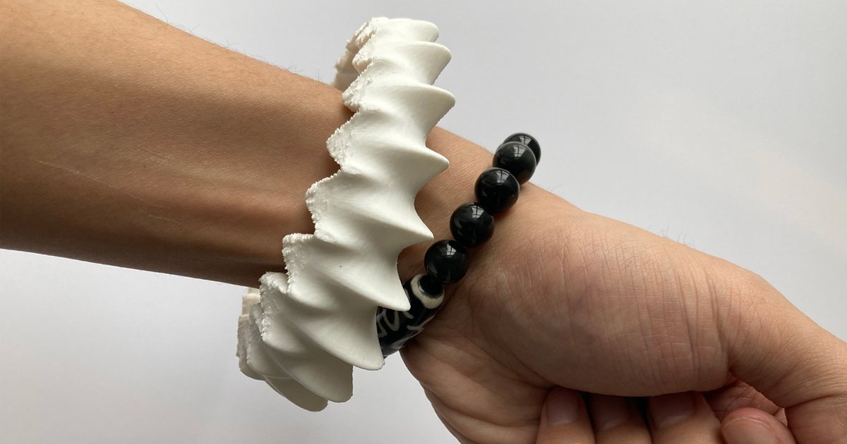 This bracelet design features a series of rippling, wave-like contours arranged in a circular form, creating an undulating and rhythmic aesthetic. Its surface texture and evenly spaced folds give it a dynamic and sculptural quality, emphasizing precision and fluidity.