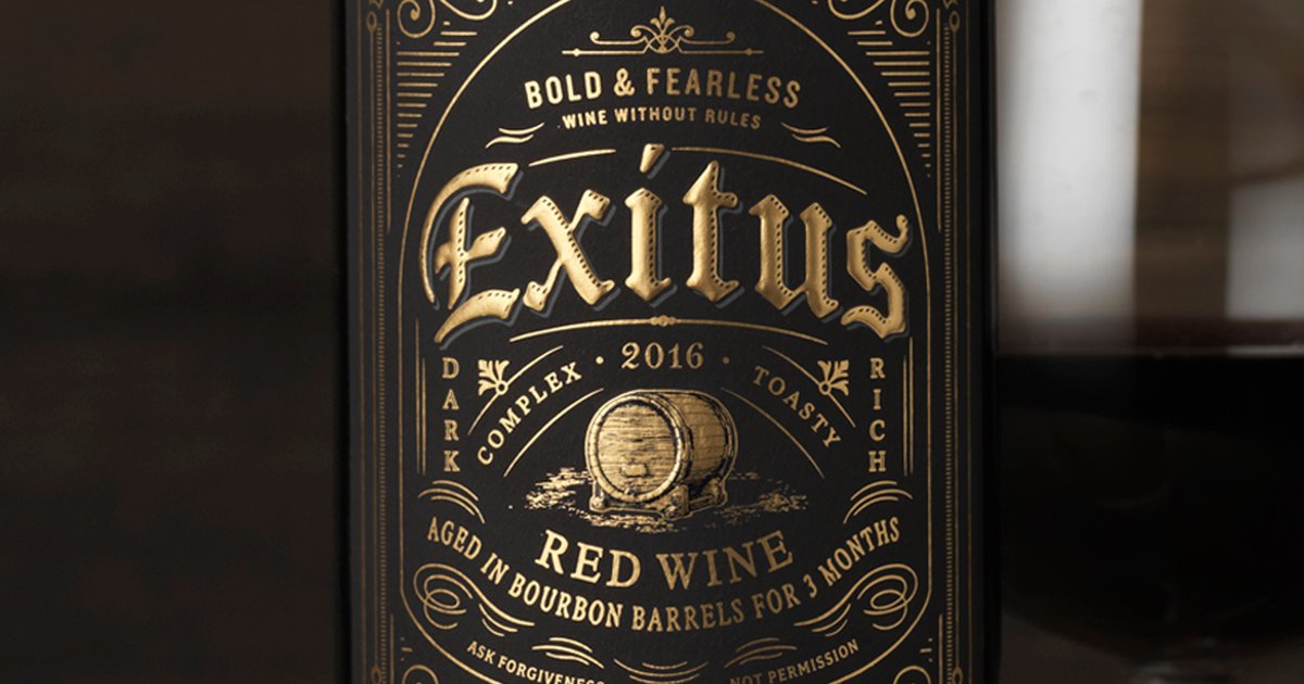 Bold and unconventional, Exitus is a red wine aged in Bourbon barrels. The design elicits a sense of luxury as well as a bit of a bad boy attitude through the use of a black label with gold foil embellishments inspired by tattoo culture. The final touch was a strip seal over the top of the closure of the bottle that calls out the 3-month age statement.