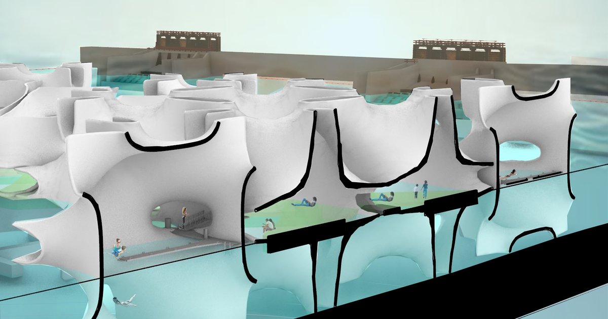 It is a series of archipelago that is walkable and connect the city edge to a new enclave. It incorporate housing inside the archipelago and outside of it. Furthermore, above the water datum the housing is floating and underneath it is submerged. It is also modular and sustainable in a way it is made out of plastic waste material to 3D print.