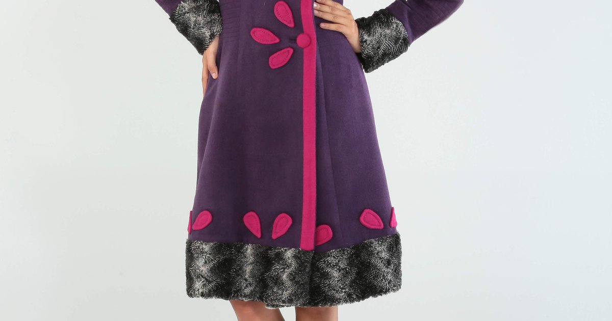 Purple coat made in angora cloth. Lined in golden satin. It has a very wide collar, hemline, and cuffs made in faux fur. It also has magenta buttons surrounded by hand-sewn tear-shaped magenta pieces to convey flowers; the tear-shaped pieces run across the hemline too. There is magenta piping. It has small pleats on the sleeves, back, and waistline.