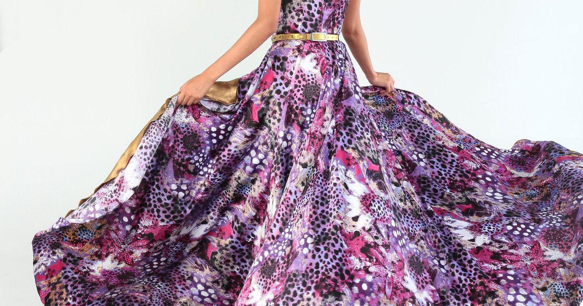 Evening gown made in satin with abstract flowery print. Crystal embroidery along the edges. It overlaps to the left giving it a wrapped visual effect. It has a collar attached by the back but leaving the cleavage open. The cleavage is V shaped and the neckline mimics the same line. It's purple with white, blue, black, yellow and magenta accents.Golden lining