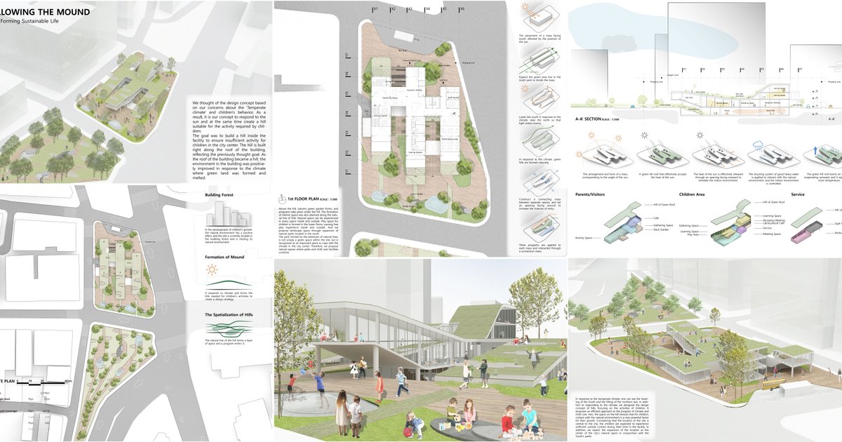 -A hill forming sustainable life- “What is the concept behind your design?” We thought of the design concept based on our concerns about the ‘Temperate climate’ and children's behavior. As a result, it is our concept to respond to the sun and at the same time create a hill suitable for the activity required by children.