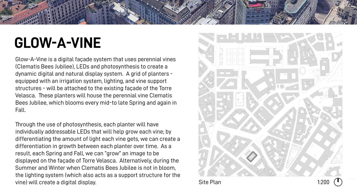 Glow-A-Vine is a digital façade system that uses perennial vines (Clematis Bees Jubilee), LEDs and photosynthesis to create a dynamic digital and natural display system.