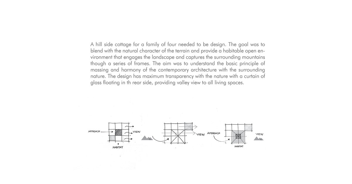 A residential project in hilly regions, where maximum views are expanded with free plan concept. I call it 'concrete in woods'. This is meant for a couple.