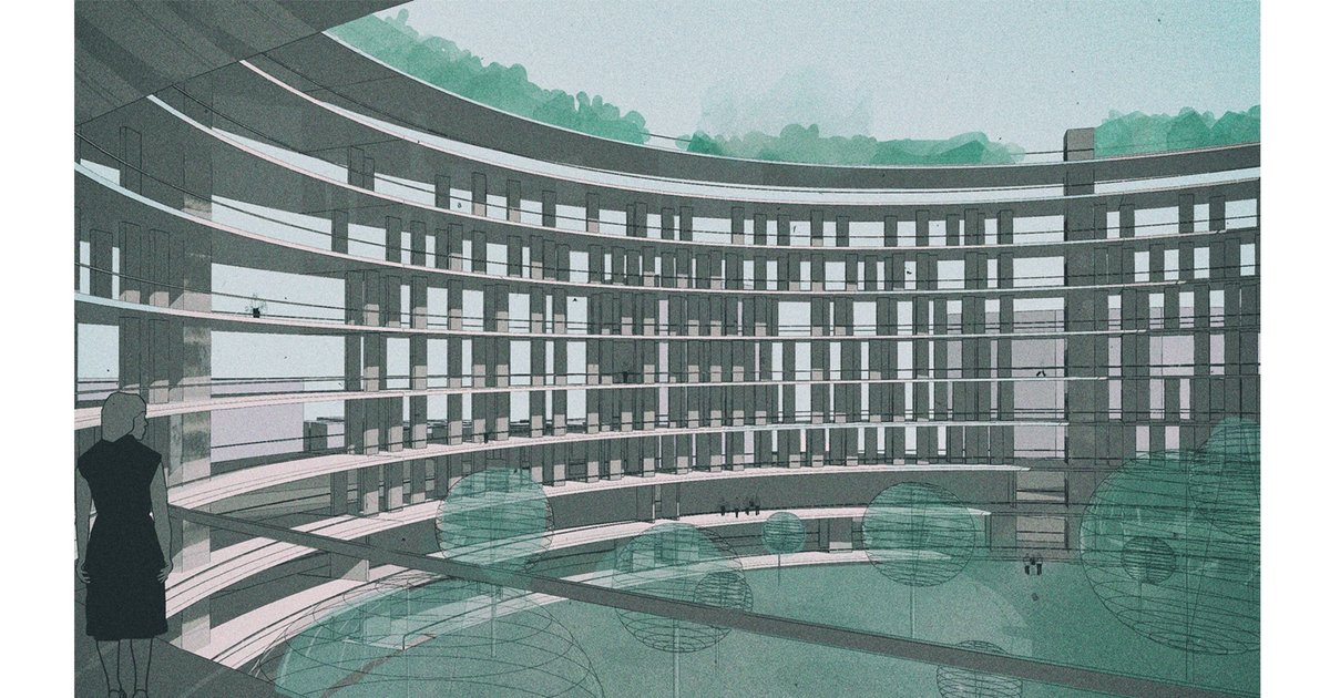 I imagined an infinite vertical cemetery in the shape of a huge circle spiraling upward continuously - conceptually the cemetery could be extended endlessly. The spiral is forming a huge circular memorial park which is accessible to everyone.