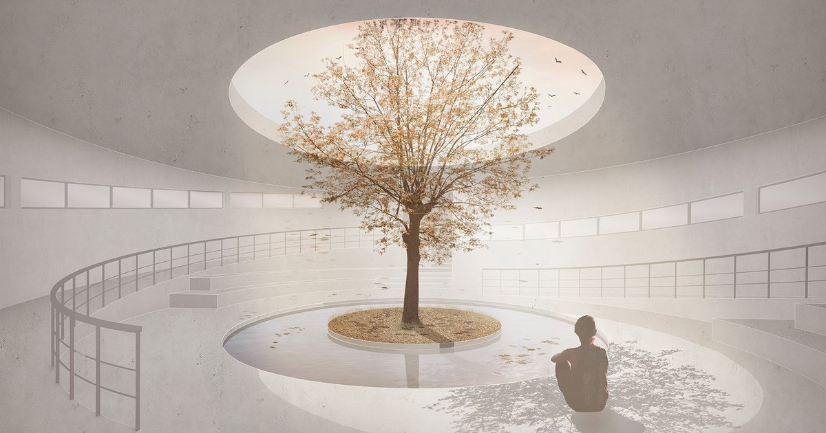 Located in a park in the heart of Beijing, the project creates a secluded space that protects users from the busy environment and prompts each individual to find their own expression of faith. Nature was used as a key element to contextualize the project while the spiral shape evokes the idea of a journey one makes towards the central space.