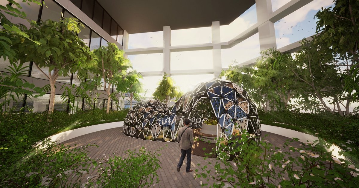A marriage of sustainable materials with modern fabrication technologies, the pavilion features two rejuvenating zones that appeal to different demographics. Regardless of zone, the form is perforated to create an enchanting dialogue between dark and light, night and day.