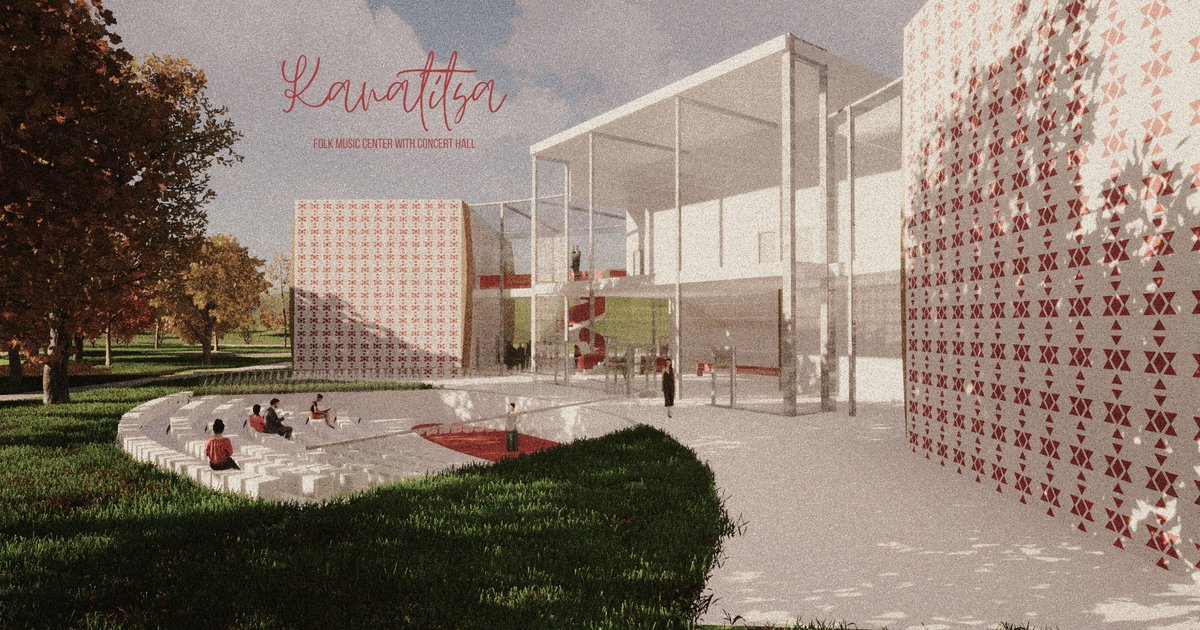 Local folk cultural center with concert hall, inspired by bulgarian culture.