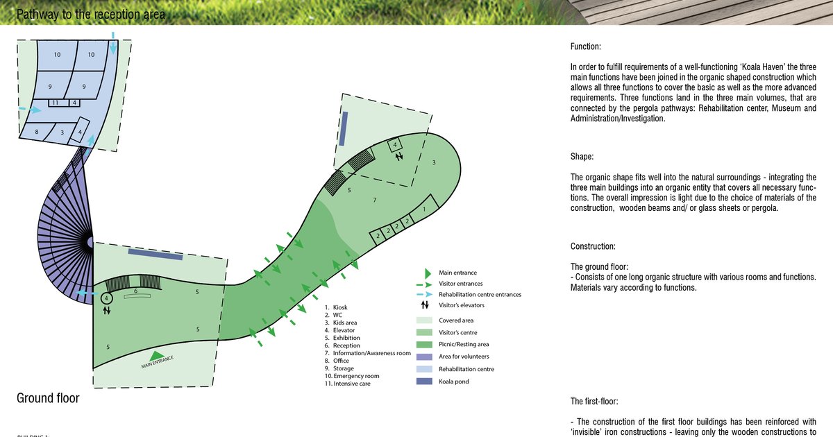 In order to fulfill requirements of a well-functioning ‘Koala Haven’ the three main functions have been joined in the organic shaped construction which allows all three functions to cover the basic as well as more advanced requirements. Three functions include Rehabilitation center, Museum and Administration/Investigation.