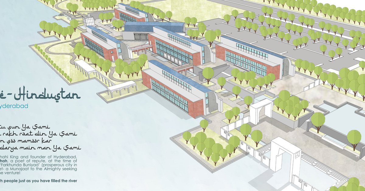As a meeting point of people, cultures, trade, geographies and climatic zones Hyderabad is a unique city. Bharat Bhavan by the lake - Axial planning with Rocks of Deccan in focus, courtyards, traditional Bazaar Street, curved roof, terraced gardens, temple square entrance courts create interesting built environment of a vibrant cultural venue for people
