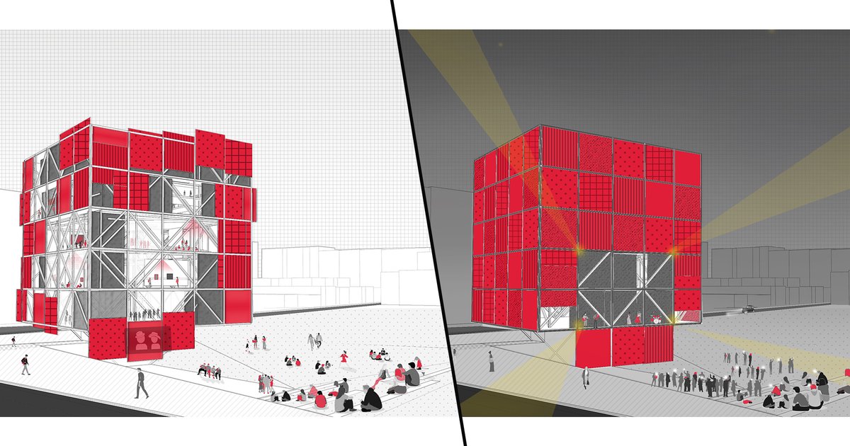The idea of interaction between building and users and the changing building is interesting. A very contemporary and versatile urban space is created. We recommend thinking from the architecture how to make this idea possible, that is to say: putting the large crane or the stretch that makes the façades changes possible - they could bepart of the building.