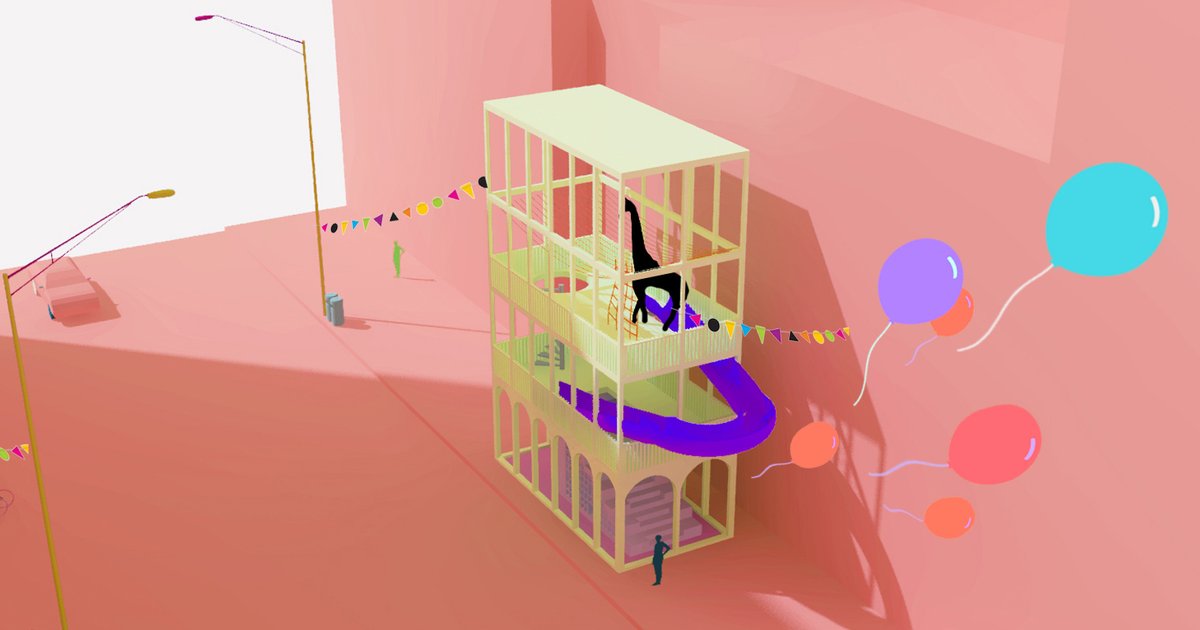 An installation that brings you the latest updates on the screens of its walls, but helps you disconnect from your phone with subtelty: it gives you a safe cubicle to lock it in and charge it! While you wait, you can have fun on the upper floors, or rest on the ground floor stairs and swings.