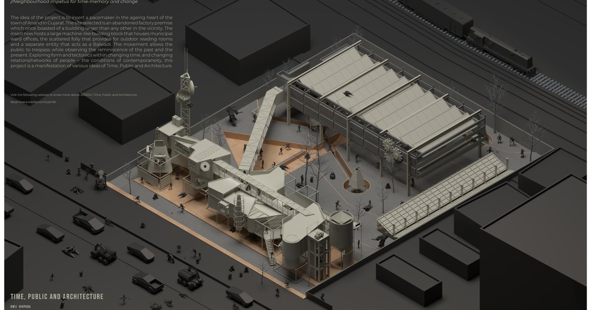 Looking at the neighbourhood as a collection of events, activities and thought-objects, the idea of this project is to insert a 'pacemaker' in the ageing heart of the town which functions like a machine that runs the city while its site edges are composed of municipal ward offices overlaying with other public activities through Time, Public and Architecture.