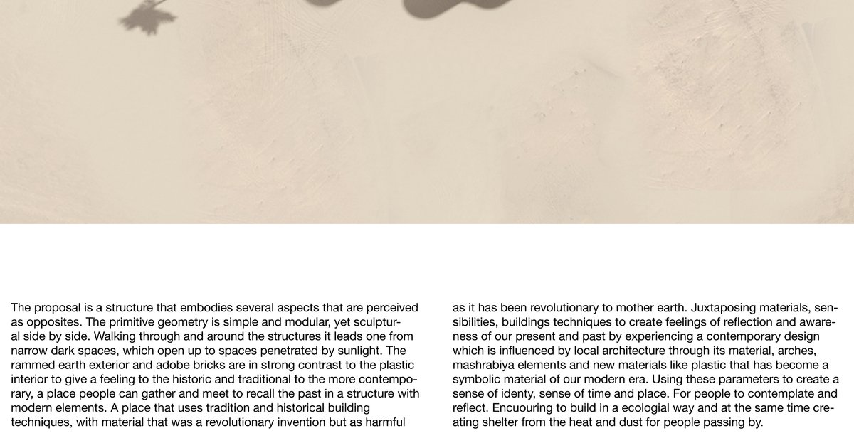 The proposal is a structure that encourages transcending and reflecting. Emphasising on parameters such as time, place and identity. Encouraging to build in an ecological way by the use of local natural material but also by focusing on plastic waste and solutions of how we can clean up our rivers and oceans.