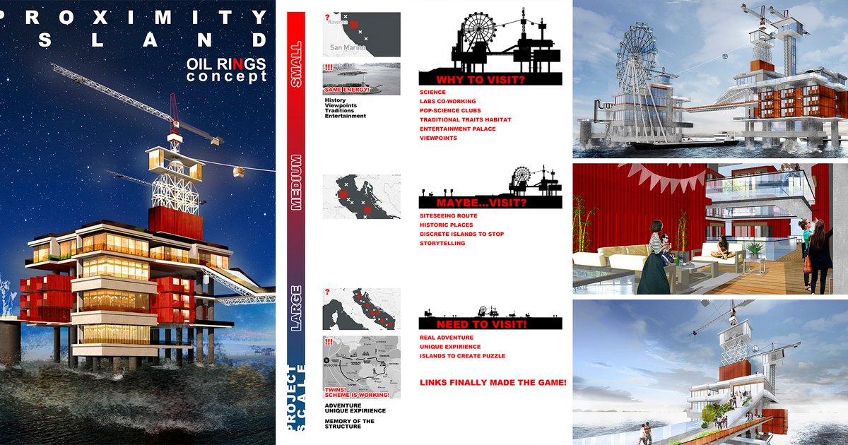We see oil rigs as a formed system of artificial uninhabited islands. It is in our power to breathe life into them, create a well-functioning system, a new type of scientific and entertainment clusters. Oil rigs should unite and turn from oil rigs into oil rings - a unified progressive structure.