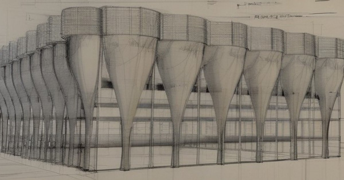 This building façade features a modern, sculptural design with elegantly curved pillars. The structure showcases a rhythmic arrangement of these pillars, which taper from a wide top to a narrow base, creating a visually striking form. The façade is a blend of organic shapes and contemporary architecture, providing a dynamic and unique aesthetic.