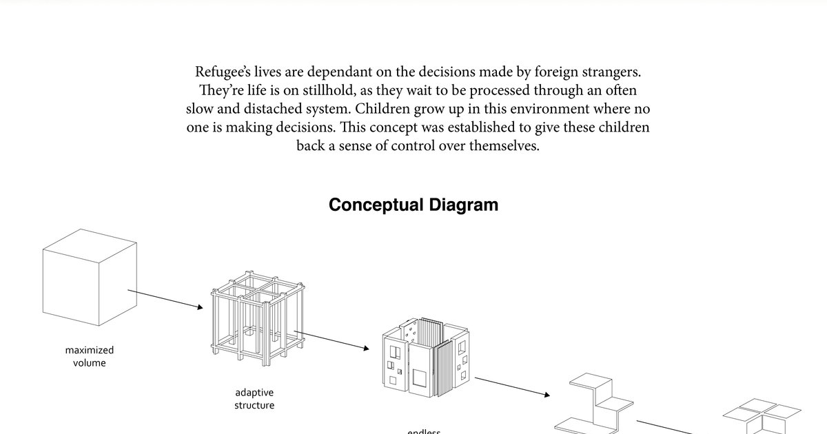 A modular and versatile installation to create educational and joyful spaces for children in refugee camps. Our concept focuses on giving control back to neglected children while creating a safe space in a chaotic and hostile environment.