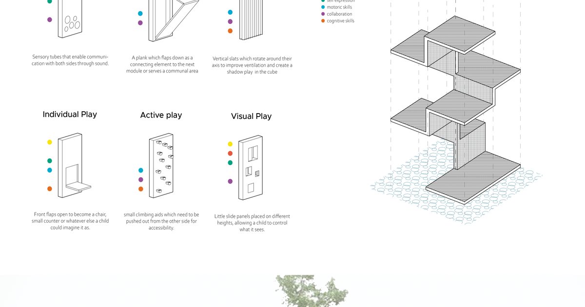 A modular and versatile installation to create educational and joyful spaces for children in refugee camps. Our concept focuses on giving control back to neglected children while creating a safe space in a chaotic and hostile environment.