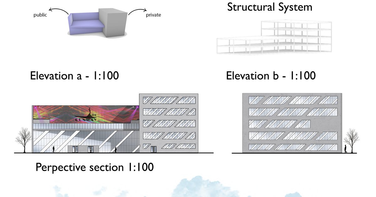 Building for the fashion industry that can offer professional workshops for the community, public runway show on the rooftop with screens to attract people from street, and offices with sewing factory in the lower level. Dividing it into to parts ( public & private). the public area includes the pubic exhibition & lounge & workshops & runway.